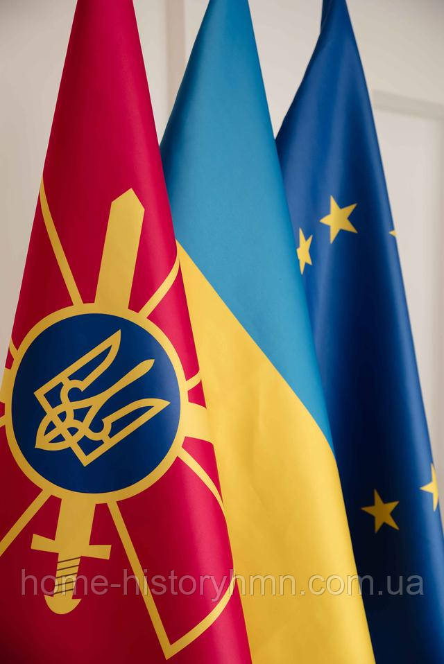 Набір для трьох прапорів Україна ЗСУ ЄС, атлас прапор 90х135 см, тримач, держак 2 м, навершя Тризуб Куля